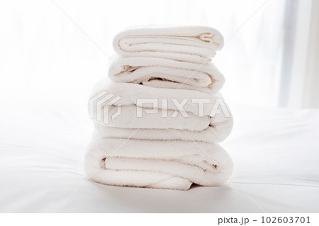 Stack of fresh clean cotton bath towels and bedding on light background, closeup
