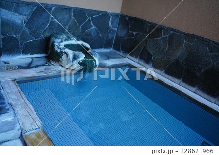 雪景色の中にある露天風呂に入っているニホンザル。温泉。雪見風呂。