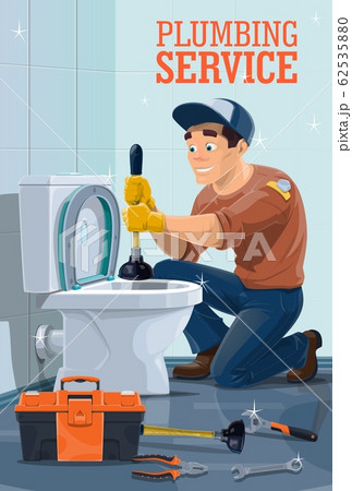 Male Plumber Cartoon with Wrench Tool near Toilet