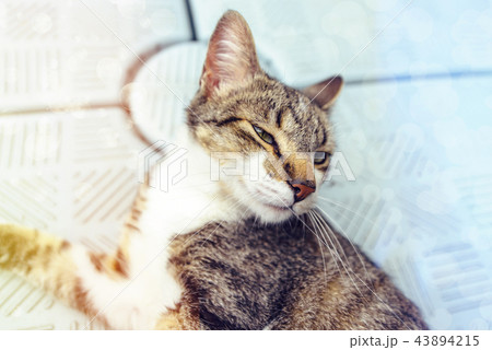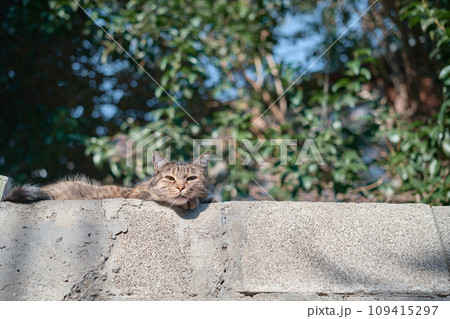 Homeless cat takes a nap on a wall in the old town, enjoying in the sun, copy space for concept, idea for animal nutrition advertising