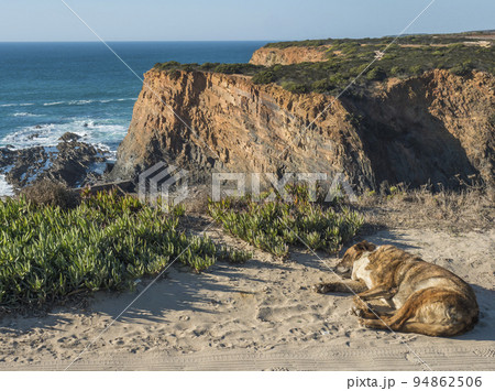 Old beige furry dog sleeping on the sand of dirt road at fishing port Entrada da Barca on backround of ocean cliffs, waves and green vegetation. Sunny day, Clear blue sky.