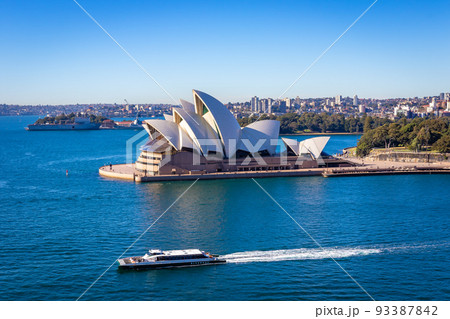 オーストラリア・シドニーのハーバーブリッジから見た、オペラハウス周辺の風景と快晴の青空