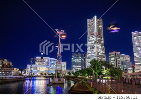 運河パークから見渡す横浜エアキャビンとランドマークタワーの風景
