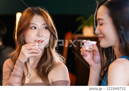 おしゃれなバーでワインを楽しむ若い女性 顔無し