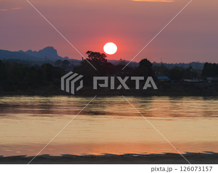 タイ・ナコンパノム メコン川越しに昇る朝日とラオスの山並み / Nakhon Phanom