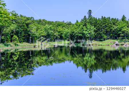 北海道知床半島にある知床五湖を、6月の澄んだ青空の下で散策する風景。湖面に映る山々と原生林が美しい。