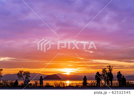 琵琶湖の夕景 湖北みずどりステーションの前で写真を撮る人々