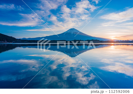 (山梨県)精進湖から望む、日の出、朝焼け、富士山