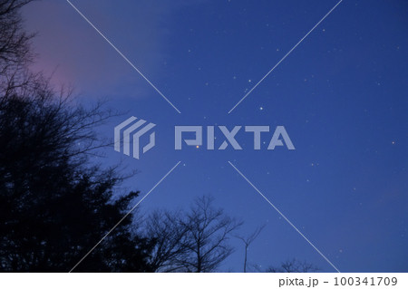 北杜市長坂町、南東の空に輝く樹上の星々。シリウスとオリオン座