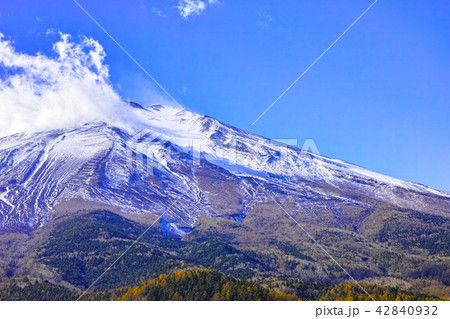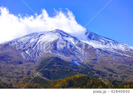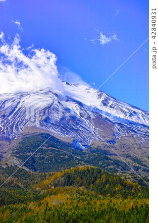 秋の冠雪した富士山と湧き上がる雲