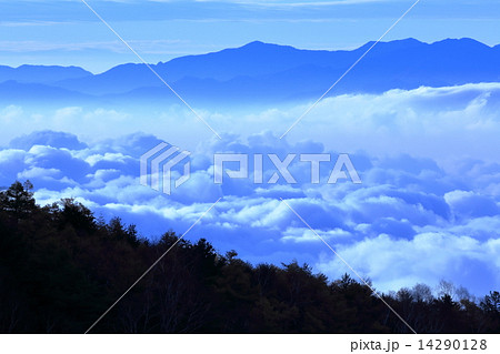 標高2000mの高峰高原より朝日を浴びて湧き上がる雲海越しに臨む南アルプス