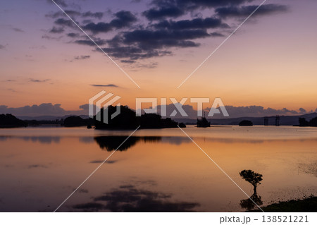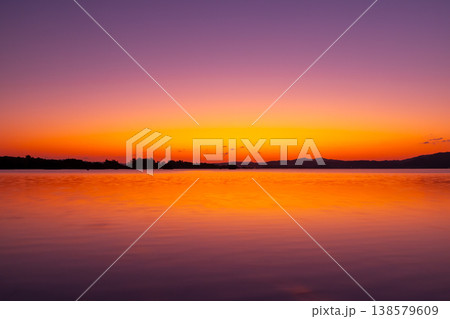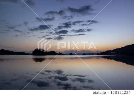 沖縄県国頭郡今帰仁村湧川 沖縄本島と屋我地島に囲まれた羽路内海に映り込む朝焼け空の水鏡