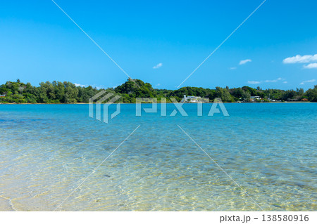 沖縄県国頭郡今帰仁村湧川 沖縄本島と屋我地島に囲まれた羽路内海の青い海と対岸の景色