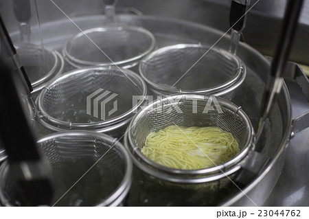 厨房でラーメンを茹でる様子
