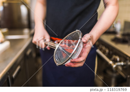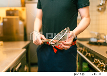 平ざるを持った店主