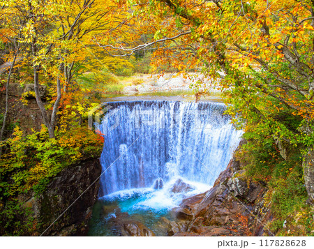 秋の谷川岳の麓 紅葉見頃の湯吹きの滝