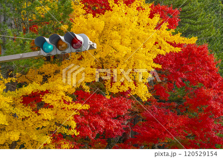湯屋谷弁財天社付近の交差点 イチョウと紅葉のコントラスト