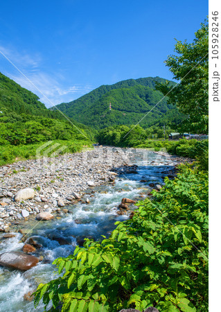 湯檜曽温泉街に流れる湯檜曽川 真夏の風景 みなかみ町