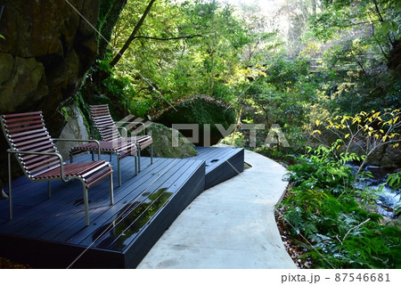 湯河原町 万葉公園万葉公園湯河原惣湯玄関テラスと紅葉
