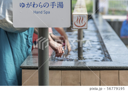 湯河原町 万葉公園湯河原惣湯玄関テラスの足湯と観光者