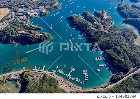 牡蠣いかだが浮かぶ英虞湾の入り江と港を望む空撮