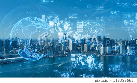 都市のドローン空撮パノラマ合成写真