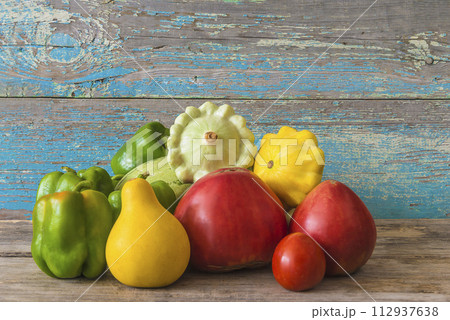 Vegan and healthy eating concept; Heap of fresh vegetables (tomatoes, cucumber, bell pepper, cabbage) on a old blue paint wooden background; copy space