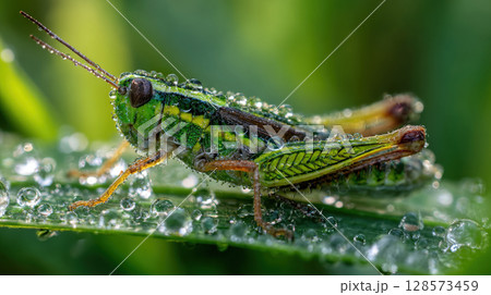 A stunning macro shot of a small green grasshopper covered in tiny water droplets, perched on a dew-covered blade of grass, with a soft, vibrant green background, emphasizing detail, nature, freshness