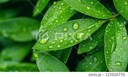Close up of vibrant green leaves with glistening water droplets, showcasing freshness and natural beauty, ideal for environmental and wellness themes.