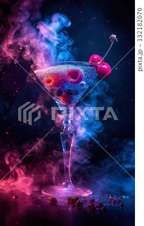 fresh and cold colorful cocktail iwth berries and fruits on black background, fance alcohol drink in fog or smoke in nightclub