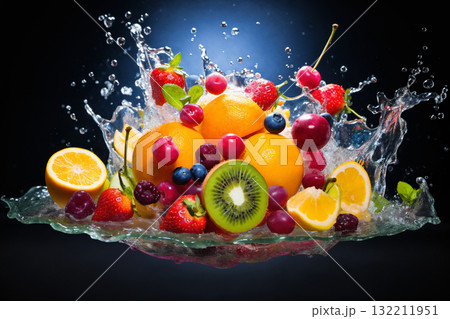 fruits mix in water splashes, on dark background, fresh and healthy food