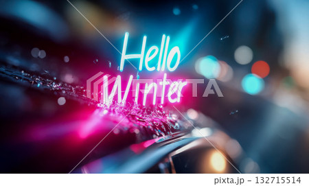 Glowing neon Hello Winter sign reflecting on a wet surface, symbolizing modern style and festive atmosphere