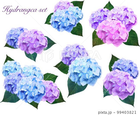 梅雨の時期に咲く美しい薄紫色と水色のあじさいと葉っぱの白バックベクター背景イラスト素材
