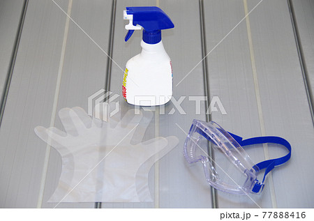 バスルームのカビ取りに使う用具(カビ取り剤、手袋、ゴーグル)