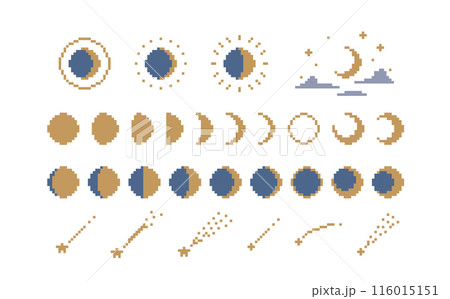 ドット絵 シンプルで可愛い月と流れ星のイラスト装飾セット 月の満ち欠け 月齢 満月 三日月 ピクセル