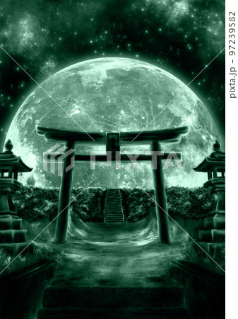 大きな月と鳥居の緑色のイラスト