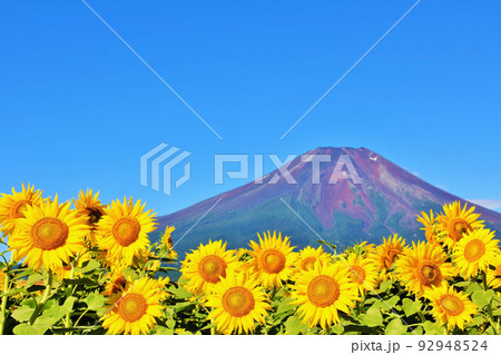 山梨県南都留郡山中湖村山中 「花の都公園」のひまわり畑と後ろにそびえる富士山の景色