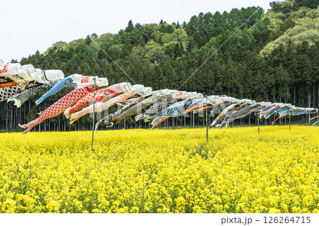 磐梯山と満開の菜の花 鯉のぼり 福島県猪苗代町