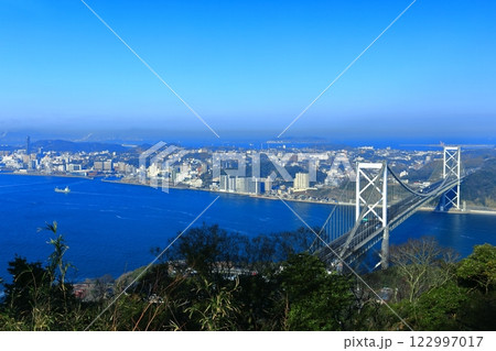壇ノ浦PAから見た快晴の関門橋(関門海峡)