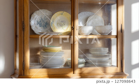 A vintage china cabinet showcases a collection of colorful dinnerware and decorative vintage dishes