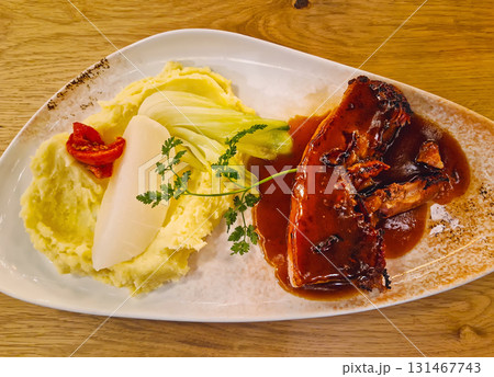 A generous plate serving creamy mashed potatoes and a portion of braised pork meat topped with a rich, dark brown sauce