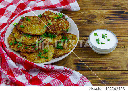 Potato pancakes with sour cream on a wooden table
