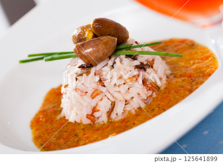 Rice with shrimps and seafood, vegetables, spices and soy sauce
