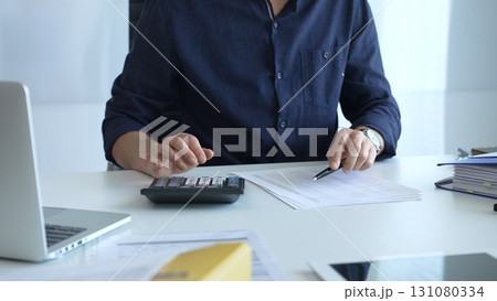 Businessman using a calculator and analyzing financial documents while preparing paperwork at an office desk. Audit and taxes, business concept