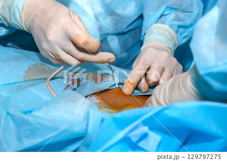Surgical procedure taking place in a sterile environment with medical professionals engaged