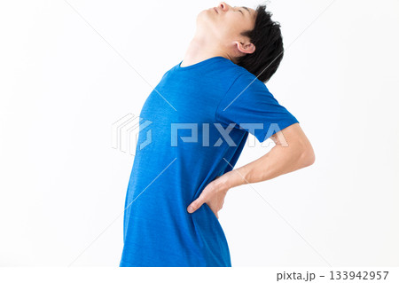 首のストレッチ体操をするTシャツ姿のミドル男性