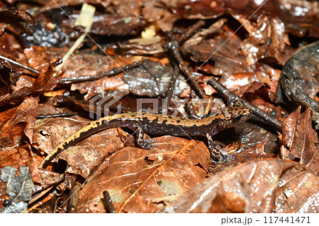落ち葉の上のバンダイハコネサンショウウオ
