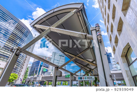 日本の東京都市景観 溜池山王駅9番出口。壁がなくオープン。左横はコマツビル。右奥に山王パークタワー