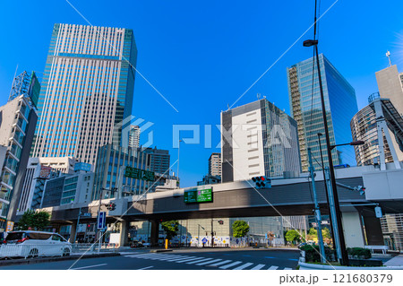日本の東京都市景観 「新橋五丁目」や新幹線などを望む(画面奥は「浜松町一丁目」交差点方向)