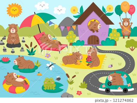 Vector capybara landscape illustration. Cute scenery with capibaras, pond, garden, house. Funny detailed scene with adorable animals swimming, relaxing, meditating. Happy land picture for kids